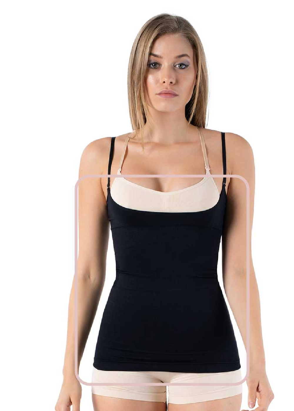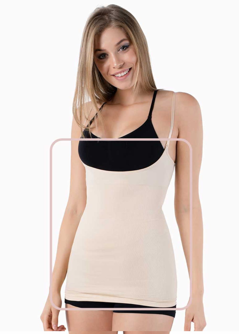 • Longueur Hanches Le caraco descend jusqu’aux hanches pour un effet gainant complet sur tout le buste, sans remonter.
