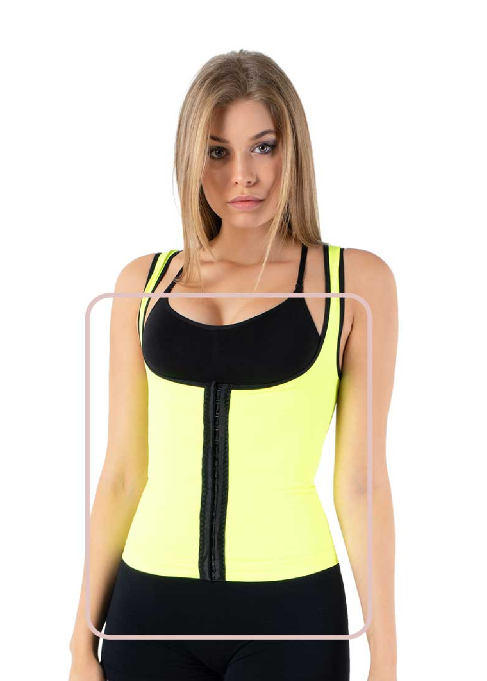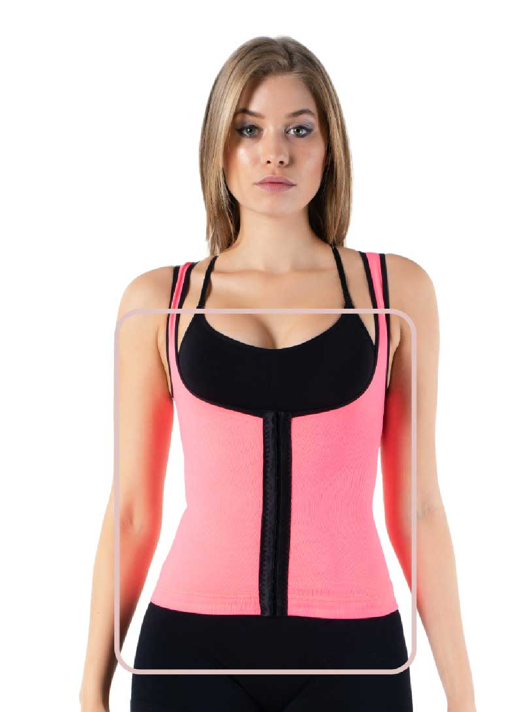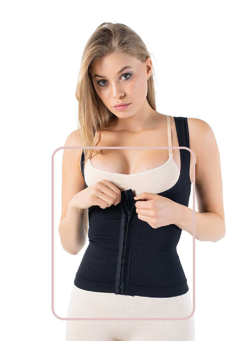 Gilet corset gainant avec fermeture éclair frontale et bustier ouvert. Compression puissante pour sculpter la taille. Bretelles larges et confortable. Made in Turkey.