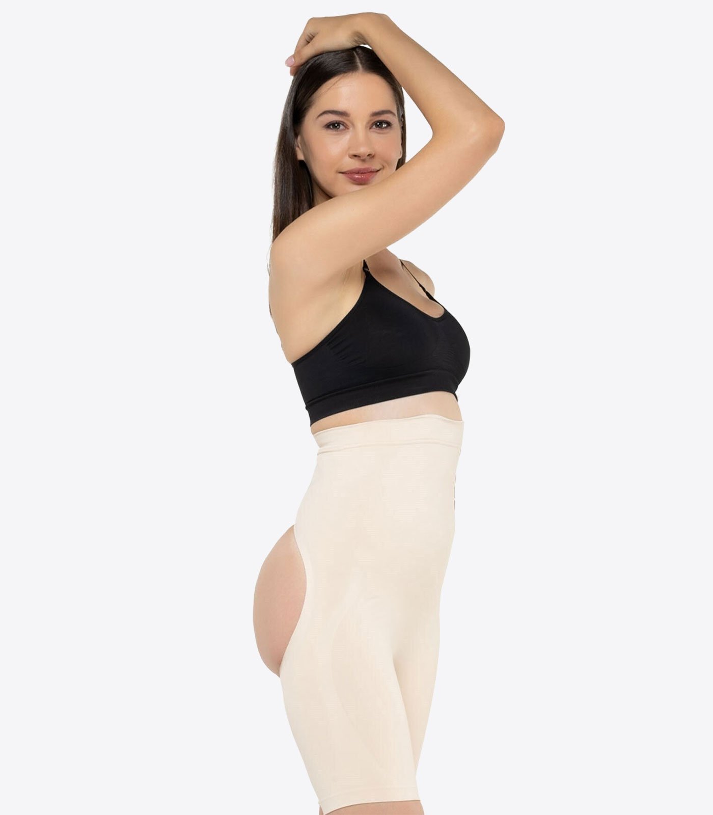 Short gainant taille haute avec découpes fesses ouvertes pour un effet push-up naturel spectaculaire. Sculpte le ventre et les cuisses tout en rehaussant et galbant vos fessiers. Sans coutures et invisible. Made in Turkey.