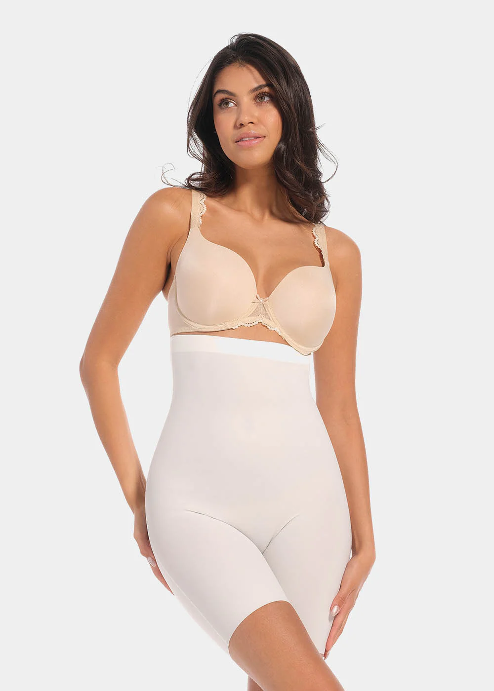Notre Short Gainant Taille Très Haute offre la couverture gainante la plus complète. Montant jusqu’à sous la poitrine et descendant jusqu’aux mi-cuisses, il sculpte l’ensemble de votre silhouette en un seul geste. Porté à la bonne taille, il vous fait paraître instantanément une à deux tailles de moins.